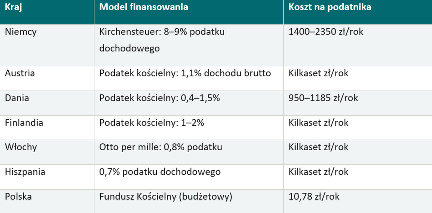 Zwróćmy uwagę na jeszcze jeden aspekt: w Niemczech Kirchensteuer (podatek kościelny) jest obligatoryjny dla wszystkich członków Kościoła i pobierany bezpośrednio przez urzędy skarbowe. To oznacza, że państwo niemieckie aktywnie administruje systemem finansowania Kościołów, angażując w ten proces cały aparat podatkowy. W Polsce Fundusz Kościelny jest prostym transferem budżetowym, niewymagającym żadnej dodatkowej infrastruktury administracyjnej. Pod względem efektywności kosztowej polski model jest bezkonkurencyjny.